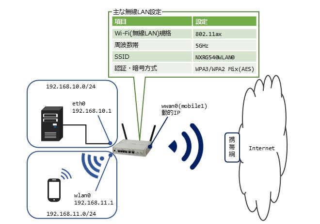 - 本設定例では LTE 回線を使用していますが、LTE 回線に対応している機種は NXR-G540/LW-CA です。