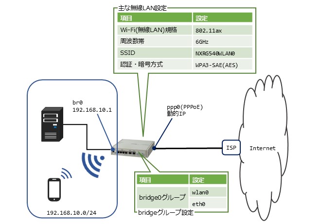 ブリッジインタフェースを使用して、有線 LAN と無線 LAN を同一ネットワークとして構成する設定例です。無線 LAN の認証方式には WPA3-SAE を使用します。