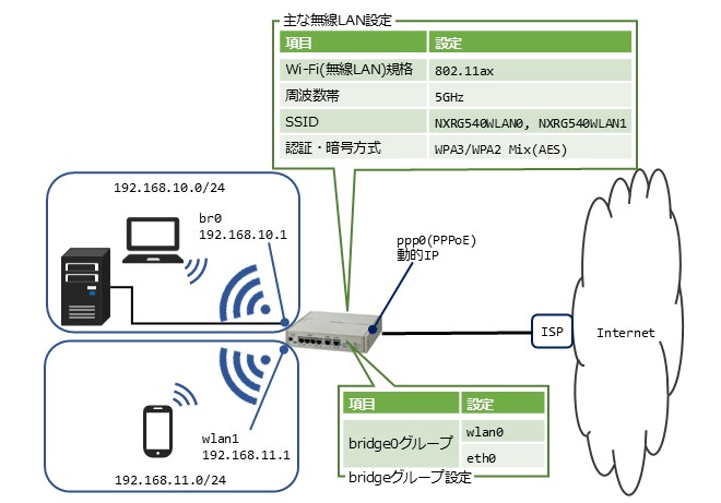 - ルータへの SSH および HTTP アクセスは bridge0 インタフェース経由の通信のみ許可します。wlan1 インタフェースからはアクセスできません。