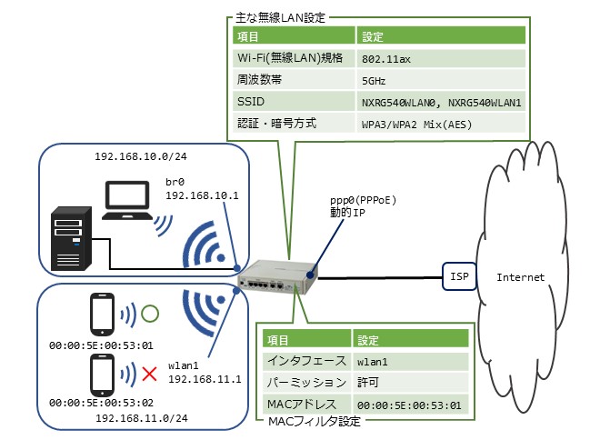 - SSID「NXRG540WLAN1」(wlan1 インタフェース)に MAC アドレスフィルタリングを設定し、指定した MAC アドレスを持つ無線端末のみ通信を許可します。