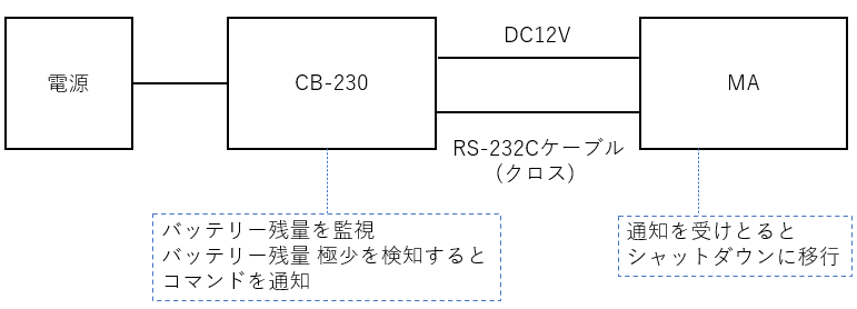 ここでは、CB-230のバッテリー残量が極少の場合、MAに通知します(MAシリーズ は CBシリーズ からのアラームをシリアル通信で受信する機能を実装しています)。MAは通知を受けとると、シャットダウン処理に移行します。この間、CB-230は内蔵バッテリーにより外部装置停止待ち時間(デフォルト:120秒)はDC出力をONにしたままなので、安全にMAはシャットダウン処理を完了できます。